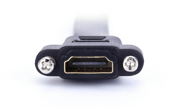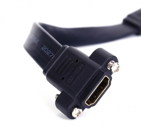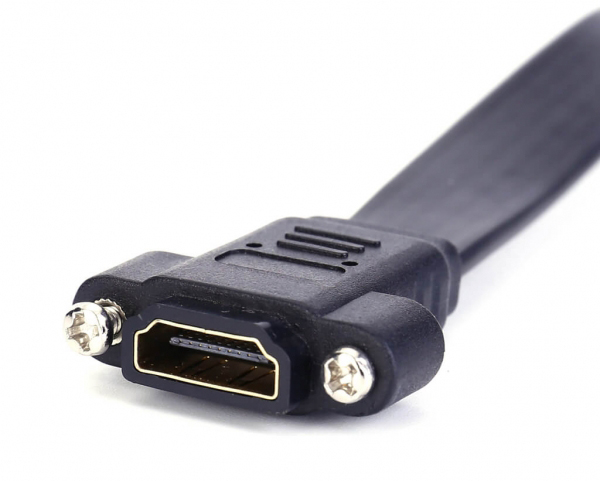 High Quality Flat HDMI Female to Female Panel Mount Cable is the perfect solution for combining two HDMI cables to achieve connectivity through a panel. This allows the user to provide display connectivity from a source that is contained within a secure location. The cable is short and designed for minimal signal loss. It supports the video resolutions up to 4K*2K@50/60 (2160p). High quality materials and construction ensure a lifetime of dependable performance. Fully-shielded conductors provide complete immunity to EMI/RFI interference, and 24-K gold plated connectors ensure superior signal transfer.
