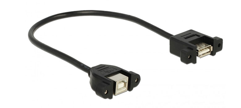 High Quality USB 2.0 B Female to A Female Panel Mount Cable is the perfect solution for combining two USB cables to achieve connectivity through a panel. This allows the user to provide connectivity from a source that is contained within a secure location. The cable is short and designed for minimal signal loss. It provides a transfer rate up to 480 Mbps depending upon the peripheral’s USB version, and easily attaches to any USB device. Foil and braid shielding provide complete immunity to EMI/RFI interference, and the twisted pair construction helps reduce crosstalk thus ensuring high speed, error-free data transfer.