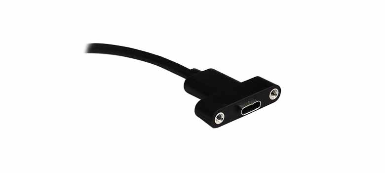 High Quality USB 3.1 Type C (USB-C) Female to Female Panel Mount Cable is perfect for combining two USB Type C cables to achieve connectivity through a panel. This allows the user to provide connectivity from a source that is contained within a secure location. The cable is short and designed for minimal signal loss. It provides a transfer rate up to 10 Gbps, and easily attaches to any USB device. Foil and braid shielding provide complete immunity to EMI/RFI interference, and the twisted pair construction helps reduce crosstalk thus ensuring high speed, error-free data transfer.